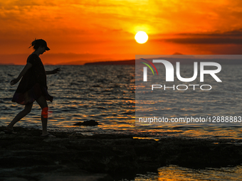 AYIA NAPA, CYPRUS – OCTOBER 18: A woman seen during a sunset along a rocky coastline near the Bridge of Love in Ayia Napa, Cyprus, on October 18, 2025.