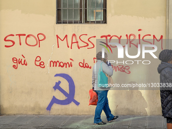 Red graffiti reading ''STOP MASS TOURISM'' and ''giu le mani da Firenze'' (hands off Florence) is displayed prominently on the light-colored wall of a building in the city center in Florence, Italy, on November 21, 2025. A purple hammer and sickle symbol is painted beneath the text. The graffiti serves as a form of activism and protest against the negative impacts of overtourism on local residents and the historic city's character.