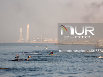 Palestinian children jump in the Mediterranean Sea next to Al-Shatee refugee camp beach in Gaza City, on November 23, 2025.