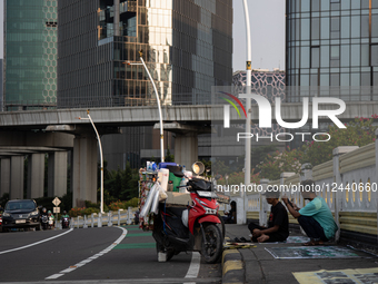 Street vendors operate along a main road in Jakarta, Indonesia, on June 3, 2025. The government implements economic incentives starting June 5, 2025, which include discounts on train, sea, and air transportation tickets; toll fee reductions; electricity tariff discounts; increased social assistance; additional food aid through the basic food card program; wage subsidy assistance (BSU); and the extension of discounts on contributions to the Work Accident Insurance (JKK) program under BPJS Ketenagakerjaan.