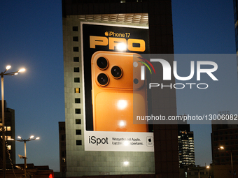 Advertisement for the Apple iPhone 17 Pro is seen on a building in Warsaw, Poland on 19 November, 2025.