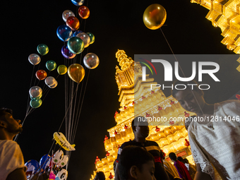 Vibrant balloons float against the backdrop of a Wat Arun-themed illuminated Durga Puja pandal in Guwahati, Assam, India, on September 30, 2025.