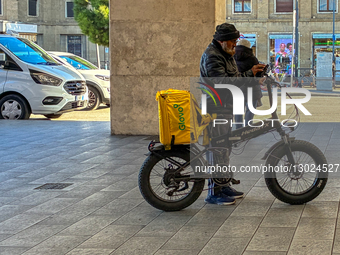 An elderly man works as a Glovo courier for the digital delivery platform and checks his mobile phone while standing next to his large-tired electric bicycle (e-bike) on a city sidewalk in Florence, Italy, on November 23, 2025. The courier wears a black leather jacket and a knit cap and carries the distinctive yellow Glovo insulated backpack for transporting on-demand goods. Parked vehicles and pedestrians are visible nearby, highlighting the contemporary gig economy and delivery services.