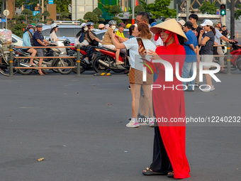 People walk and take photos along a shaded sidewalk near the Saigon Opera House in Ho Chi Minh City, Vietnam, on April 6, 2025. The area is a popular gathering spot for tourists, often used for street photography and cultural exploration.
