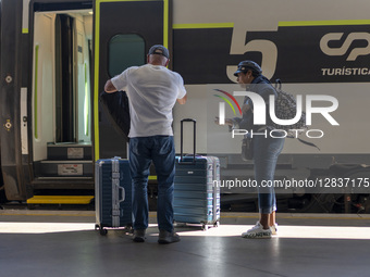People wait to get on a train to Porto in Lisbon, Portugal, on October 4, 2025. The arrival of autumn brings scattered showers and cooler temperatures across northern Portugal, with daily life continuing despite the wet conditions.