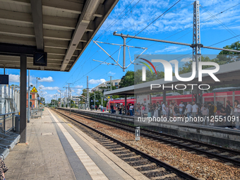Passengers wait on the platform at Memmingen railway station beside a red regional DB train in Memmingen, Swabia, Lower Allgaeu, Allgaeu, Germany, on July 12, 2025. The station serves as a hub for regional travel in the area.