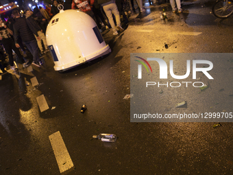 Protesters attempt to block the road with a trash container and broken bottles to stop the towing of the bus belonging to Milomir Jacimovic near the Banovina building in Novi Sad, Serbia, on November 17, 2025.