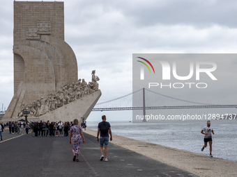 Visitors admire the Monument to the Discoveries (Padrao dos Descobrimentos), located on the banks of the Tagus River. Built in 1960 to commemorate the Portuguese Age of Discovery, the monument honors the nation's great explorers, In the background stands the 25 de Abril Bridge, an iconic red suspension bridge often compared to San Francisco's Golden Gate, connecting Lisbon to Almada across the river on October 08, 2025 in Lisbon, Portugal. NO SALES POLAND