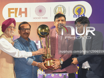 Veteran Olympian Gurbax Singh, Hockey India President Dilip Trikey, West Bengal State Sports Minister Aroop Biswas, Sujit Bose, President of Hockey Bengal, and State Fire Minister participate in the FIH Men's Junior Hockey World Cup Trophy Tour. The prestigious World Cup trophy travels across 20 cities in India at the Vivekananda Yuba Bharati hockey stadium in Kolkata, India, on November 16, 2025.