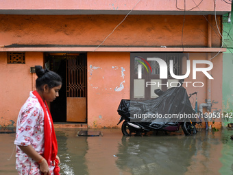 A woman walks through a waterlogged street after heavy rains triggered by Cyclone Ditwah in Chennai, India, on December 3, 2025.