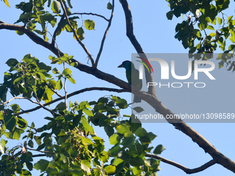 A Blue-throated Barbet bird sits on a tree branch while it searches for insects and tree fruits in Siliguri, India, on November 21, 2025.