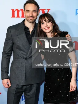 English actor Charlie Cox and American actress, singer, songwriter, and producer Zooey Deschanel arrive at the Los Angeles Special Screening Of Amazon Prime Video's 'Merv' held at The Culver Theater on December 4, 2025 in Culver City, Los Angeles, California, United States.