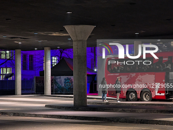 Passengers board a Kantic Line intercity bus, bound for cities in Bosnia and Herzegovina, at the Central Bus Station (ZOB) in Munich, Bavaria, Germany, on October 30, 2025. The bus station is busy at night, serving long-distance European travel and connections.