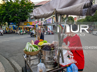 A woman prepares colorful sticky rice at a roadside food cart on a busy street corner in Ho Chi Minh City, Vietnam, on April 7, 2025. Street food remains a vital part of everyday life and culture in Vietnam, offering quick, affordable meals across bustling urban intersections.