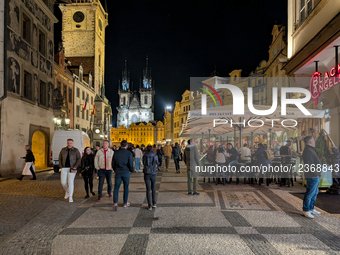 People walk through the bustling Old Town Square past outdoor cafes and historic buildings, with the illuminated Church of Our Lady before Tyn and the Old Town Hall Tower visible in the background in Prague, Czech Republic, on May 10, 2025. The square remains a vibrant center of nightlife, tourism, and social interaction.