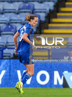 Emily van Egmond of Leicester City plays in defensive action during the Barclays FA Women's Super League match between Leicester City and Manchester City at the King Power Stadium in Leicester, on December 7, 2025.