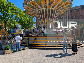 Visitors watch as children ride a traditional swing carousel at the Auer Dult fair in Munich, Germany, on April 29, 2025. The ride is set up on Mariahilfplatz near the Mariahilfkirche and is part of the fairground attractions that accompany the market section of the historic event.