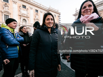 Former Mayor of Rome, Virginia Raggi, and Linda Meleo are participating in a demonstration by committees in Piazza del Campidoglio in Rome, Italy, on December 2, 2023. They are asking the municipal administration and the Mayor of Rome, Roberto Gualtieri, to halt the construction of the waste-to-energy plant in the Santa Palomba area, south of the city.