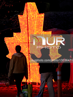 People walk by an illuminated maple leaf light installation in Gage Park downtown Brampton, Ontario, on November 28, 2025.