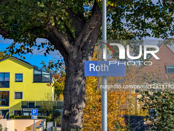 A blue, rectangular sign marks the town limit of ''Roth'' next to a large tree with visible bark and green foliage. Modern residential buildings with vivid yellow facades and large windows appear in the background, displaying autumn colors in Roth, Middle Franconia, Bavaria, Germany, on October 18, 2025.