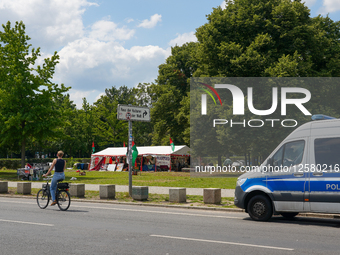 A police car is at the pro-Palestinian protest camp with Palestinian flags and banners set up near the Reichstag and Federal Chancellery in the government district of Berlin, Germany, on July 19, 2025. Tents, signs, and a large white protest pavilion express solidarity with Palestine and criticism of Israel.