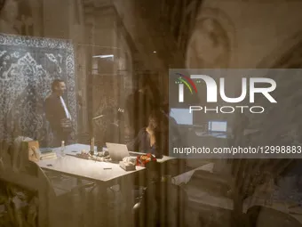 An Iranian man works with his laptop at a center for creativity and innovation in Tehran, Iran, on November 17, 2025. Tehran Design Week is an inclusive event that weaves design into the fabric of urban life, creating a platform for creative dialogue among designers, producers, and enthusiasts.