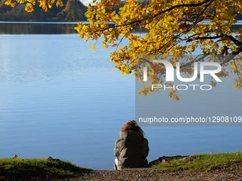 A woman sits alone by the shore of Lake Staffelsee, looking out over the calm water as golden autumn leaves frame the scene in Murnau am Staffelsee, Upper Bavaria, Bavaria, Germany, on October 24, 2025.