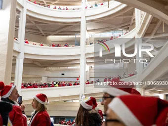 People wearing Santa Claus costumes walk inside Lingotto Fiere during the Santa Clauses gathering on December 7, 2025.