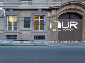 The exterior view of the Senate of the Parliament of the Czech Republic shows its main wooden portal and official plaque. It is located in the Wallenstein Palace complex in Prague, Czech Republic, on May 9, 2025. The building serves as the upper chamber of the Czech legislative system and is situated in the historic Mala Strana district.