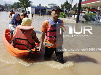 Rescue workers evacuate residents during flooding in Dayeuhkolot, Bandung Regency, West Java, Indonesia. After heavy rain sweeps through the area, the overflowing Citarum River inundates residential neighborhoods with water levels ranging from 50 centimeters to two meters, disrupting daily activities and paralyzing transportation access.