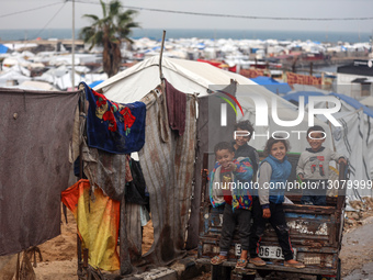 Displaced Palestinian children play outside their tent in Gaza City, Palestine, on December 10, 2025, following heavy rainfall.