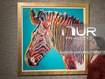LONDON, UNITED KINGDOM - JUNE 23, 2025: A staff member looks at "Grevy's Zebra, from Endangered Species" by Andy Warhol, estimate: £70,000 - £100,000 during a photocall for "Prints & Multiples" sale at Bonhams auction house in London, United Kingdom on June 23, 2025.